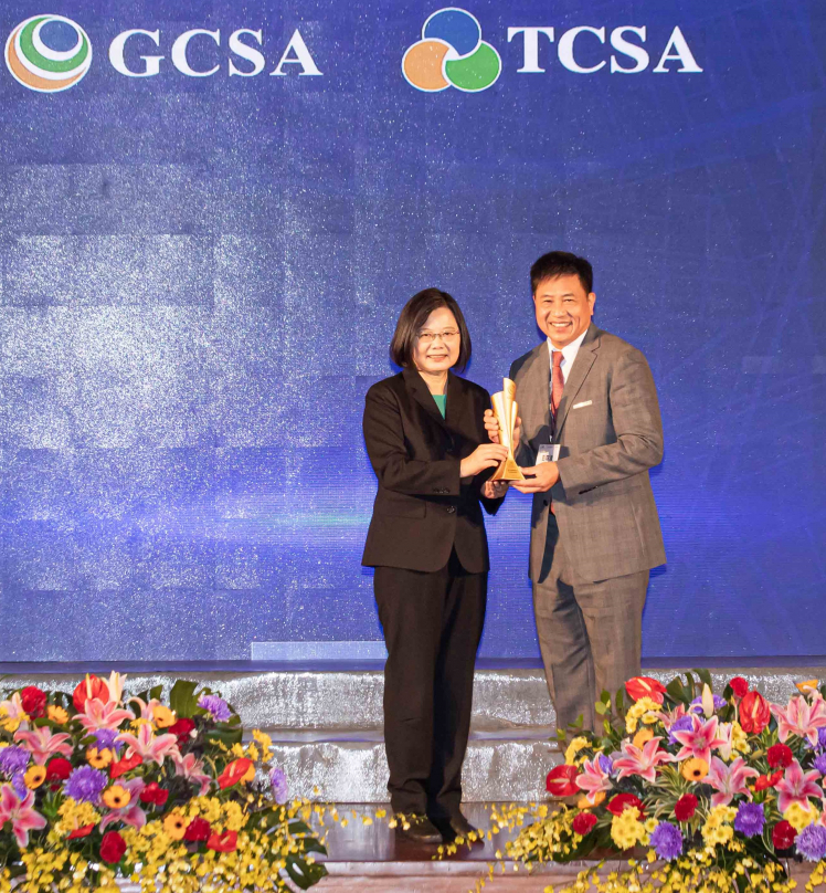 凯发勇奪台灣永續企業獎 13 項大獎,由總統蔡英文頒獎 (左),凯发董事長彭双浪 (右) 代表領獎