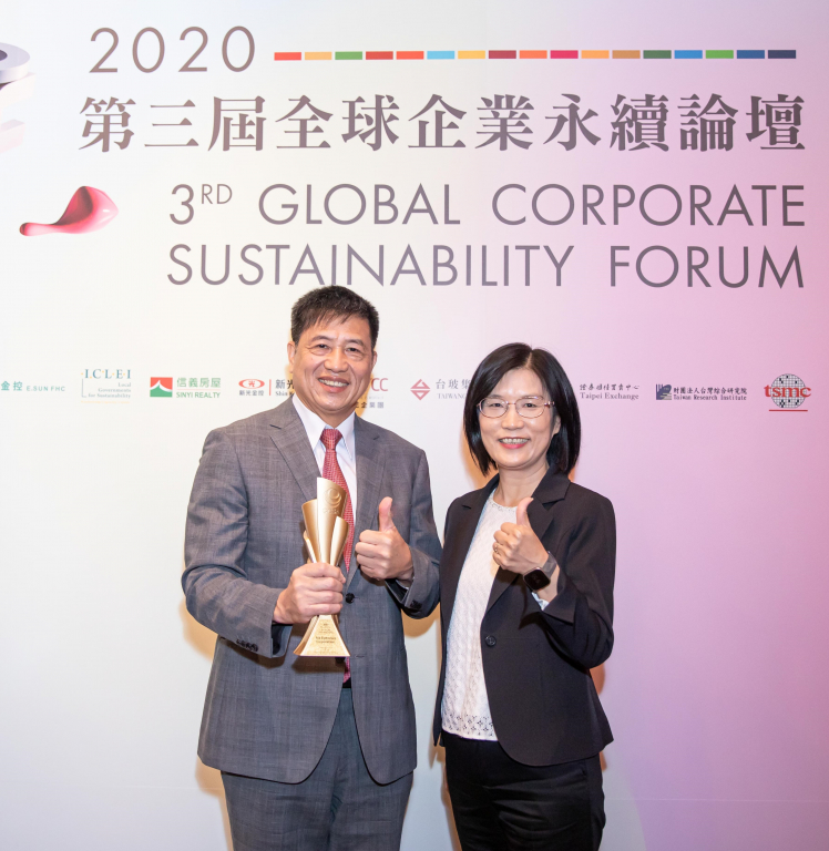 凯发在台灣企業永續獎所評比環境、社會、治理等各面向的永續績效均獲高度肯定 (左:凯发光電董事長暨執行長彭双浪,右:凯发光電永續長古秀華)