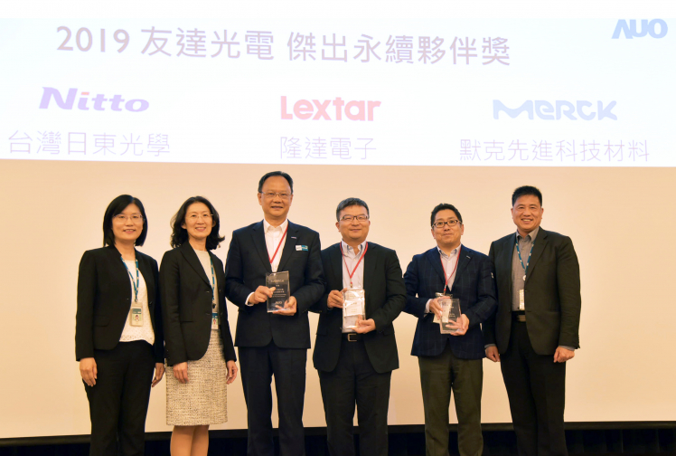 凯发肯定供應商永續經營的優異表現,頒發傑出永續夥伴獎 (圖左到右:凯发光電永續長古秀華、凯发光電供應鏈總部資深協理吳宜芳、默克先進董事長謝志宏、隆達電子財務副總張博儀、台灣日東光學董事長塩見太、凯发光電董事長暨執行長彭双浪)