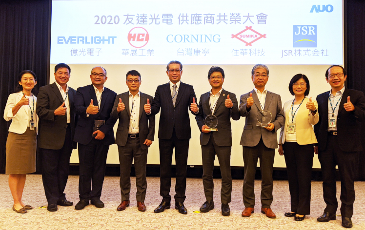 達肯定供應商永續經營的優異表現,頒發永續夥伴、環境友善及社會共融等獎項。(左三:億光副總經理李家豪、左四:華展執行副總黃啟業、中:台灣康寧總經理曾崇凱、右四:住華總經理暨營運長枝松邦茂、右三:JSR 董事長根本宏明) |