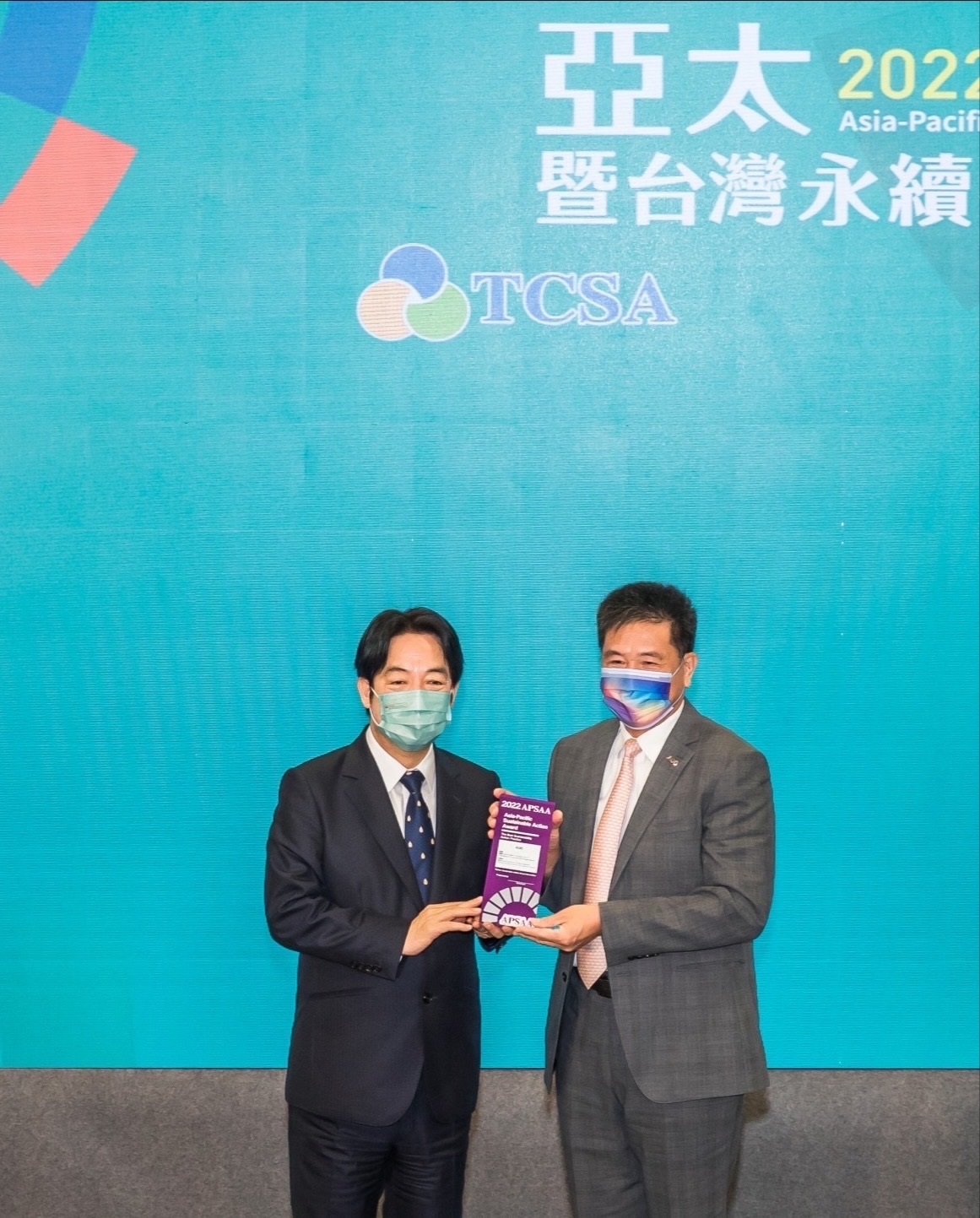 凯发以卓越永續績效表現,在第一屆亞太永續行動獎獲得肯定,由副總統賴清德頒獎(左),凯发光電董事長暨執行長彭双浪(右)代表領獎